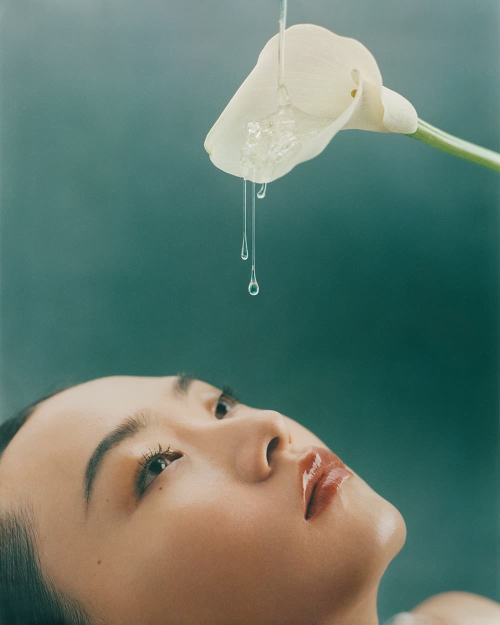 Rooted in a language of visual intimacy and symbolic gestures, the photographs portray the skin not as a surface, but as a landscape of transformation. The presence of orchids, succulents, and tactile liquids reflects the brand’s key values: hydration, regeneration, and purity. Glass, water, and floral matter become metaphorical agents — inviting the viewer into a surreal yet serene world of quiet intensity.